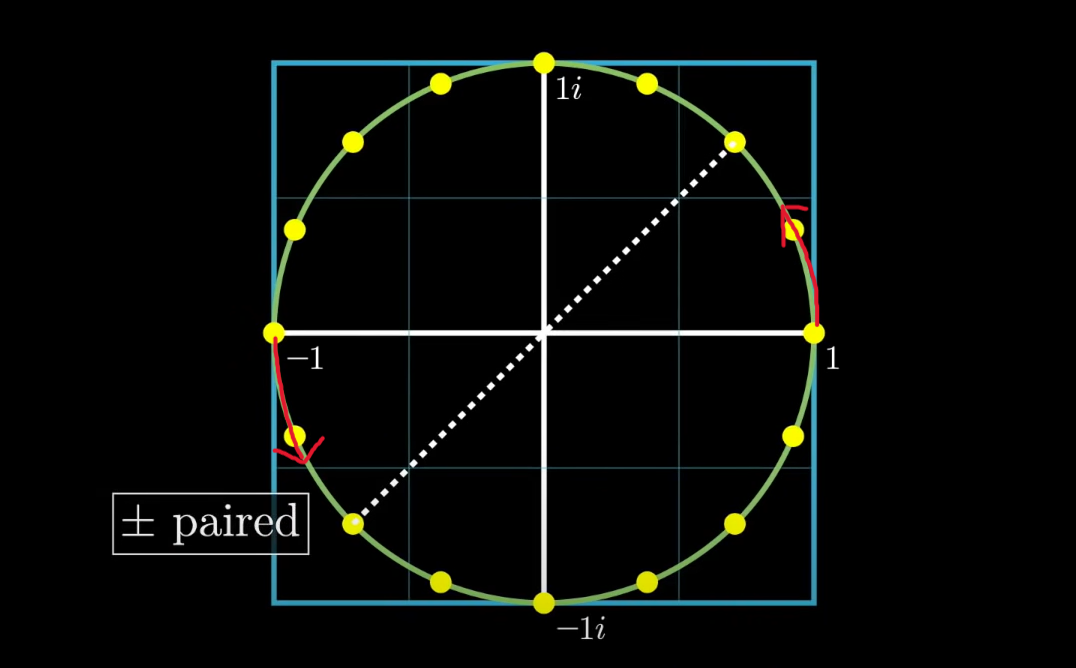 那么需要选取\([e^{\frac{2\pi i}{16}\cdot w}],w=[0,1,2,…,7]\)位置的复数。即图中实数轴上半部分的黄色点,包括(1,0),但是不包括(-1,0)。至于\([e^{\frac{2\pi i}{16}\cdot w}],w=[8,9,2,…,15]\)这几个复数是利用奇偶性。