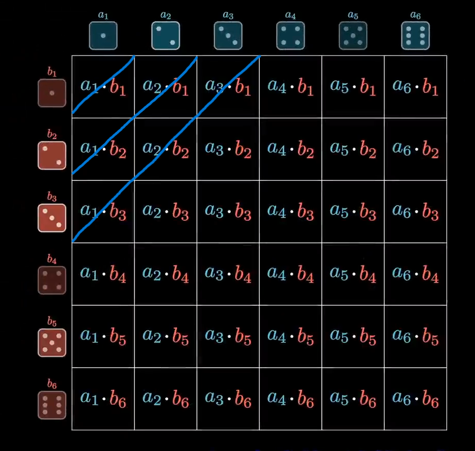 \(P(sum=3)=a_{1}*b_{2}+a_{2}*b_{1}\)
