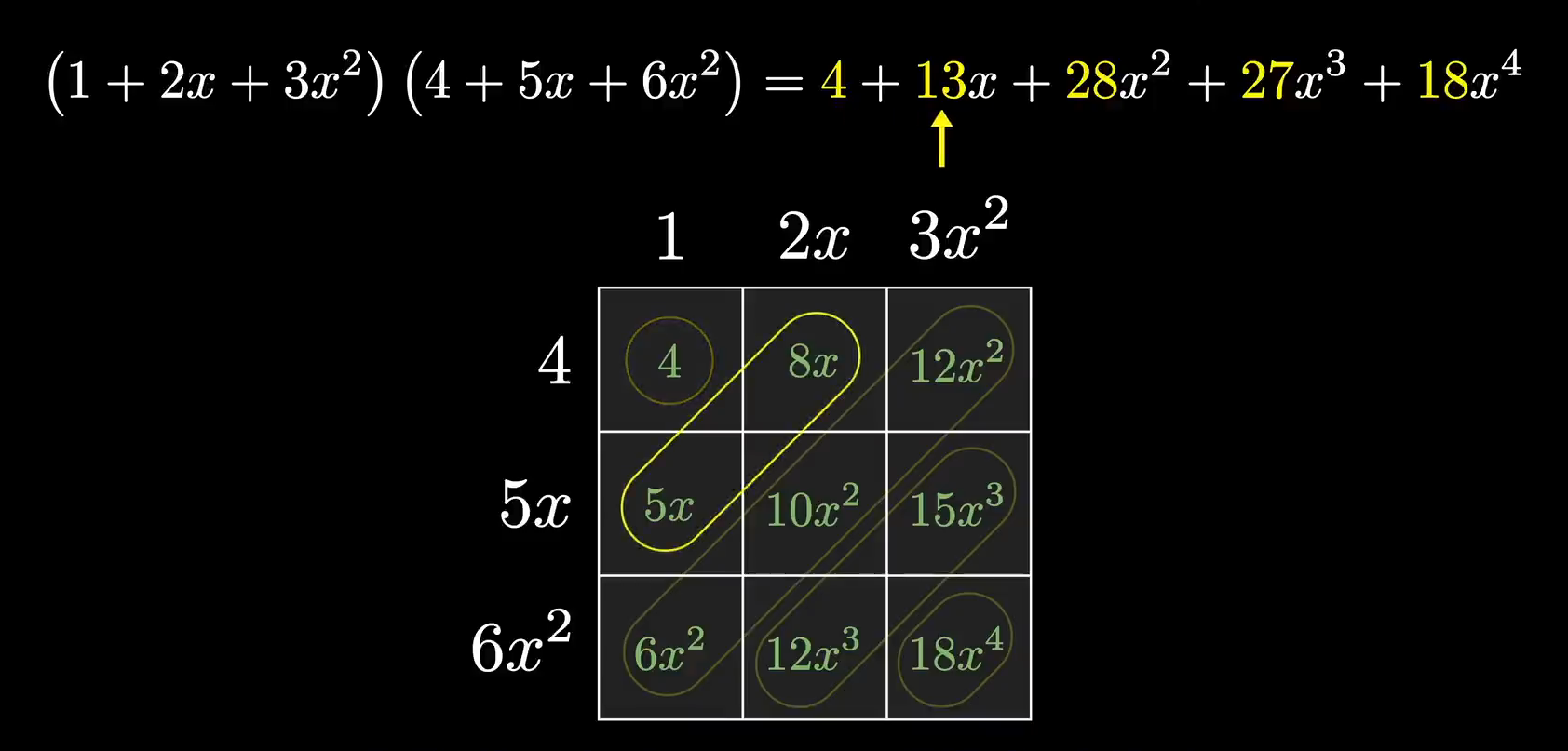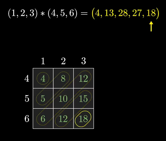 如果以多项式乘法的角度来观察这个表格,我们可以发现离散卷积算的是两个多项式相乘得到的各项系数